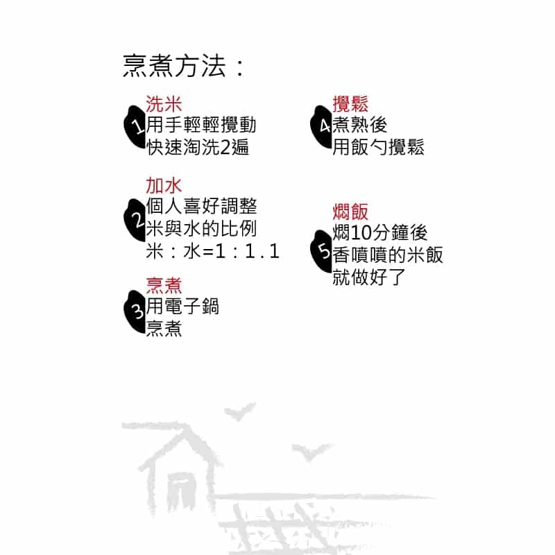 ★商品特色:農業專家輔導農作, 無毒自然農法栽種。 ★商品規格:500g/包 ★保存期限:180天 ★生產國: 台灣 ★烹煮方式: 洗米很重要!用少許清水輕輕攪動兩下,請立刻把水倒掉,反覆2-3次,水清了即可.務必水濾乾,米 :水比例 1: 1.1,倒1~2滴橄欖油風味更佳。